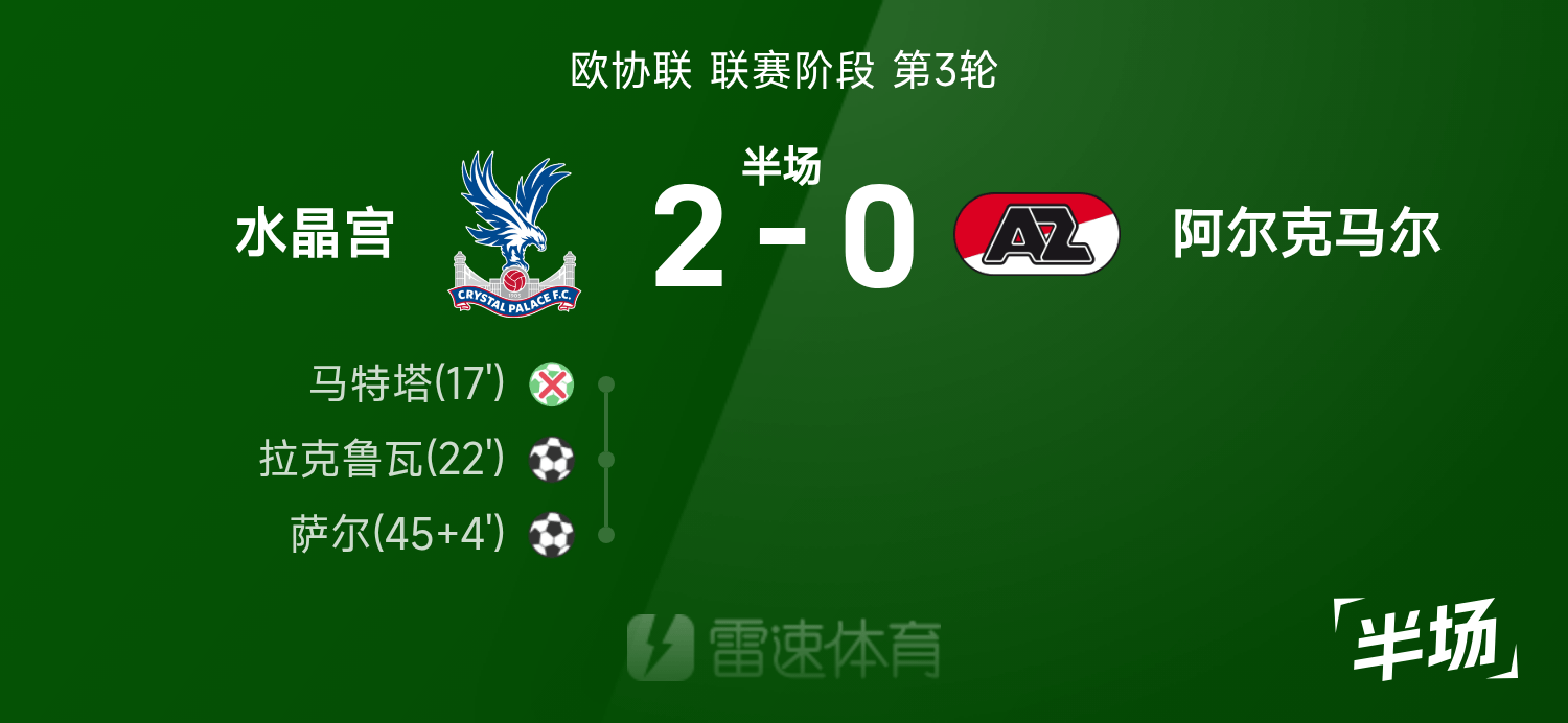 欧协联半场:马特塔失点,拉克鲁瓦传射,水晶宫2-0阿尔克马尔