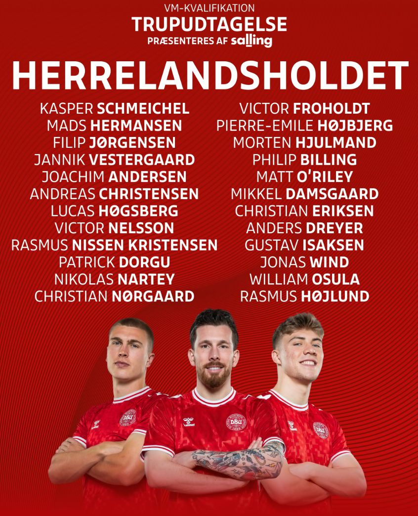 6686体育11月6日讯 11月份的国际竞赛日,丹麦将迎来两场世杯赛欧洲区资格赛,分别对阵白俄罗斯和苏格兰。今天丹麦队官方公布了新一期的国家队大名单,其中霍伊伦领衔锋线,中场埃里克森入选。