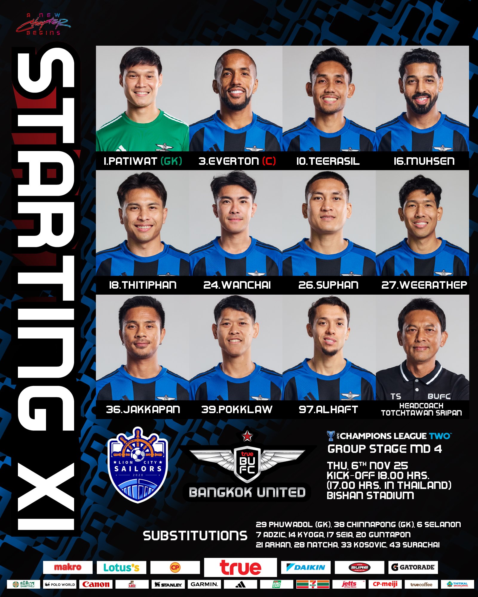 北京时间11月6日18:00,亚冠二级联赛事分组赛阶段第四轮,狮城水手主队场迎战曼谷联,赛前首发公布。