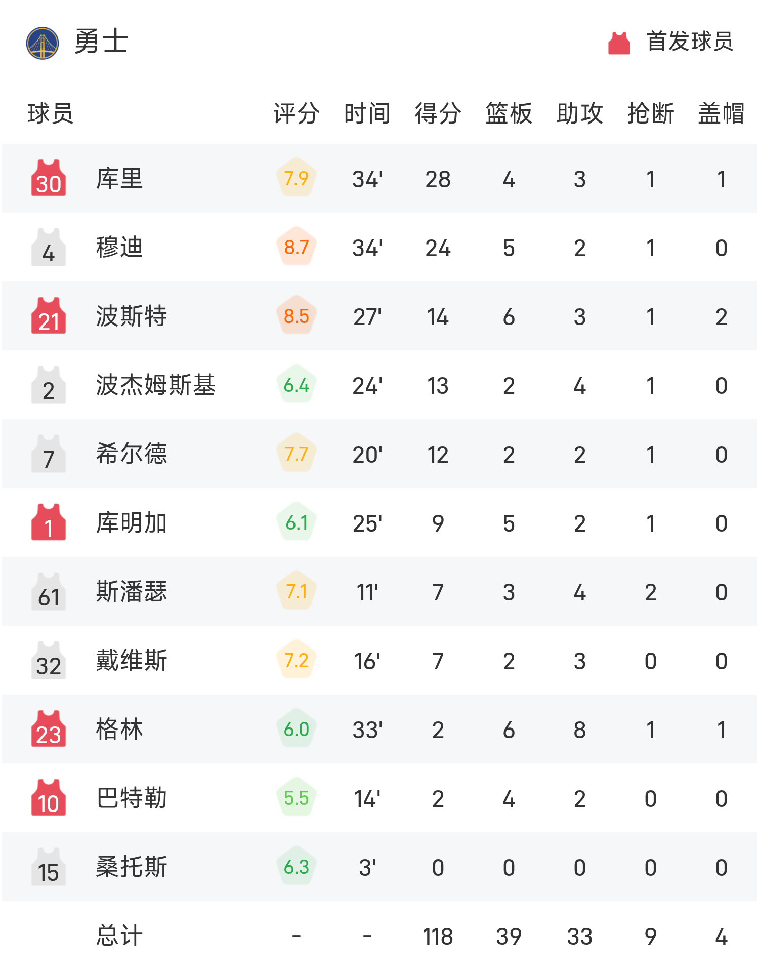 NBA战报:库里28分,布克空砍38分,勇士118-107击败太阳