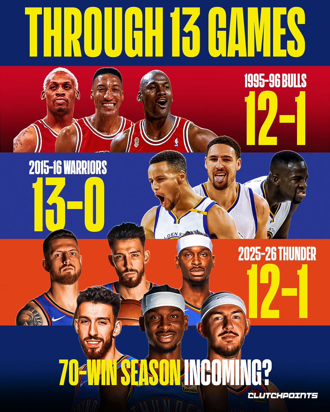 如今雷霆队开局前13场战绩比肩1995-96赛季的公牛,有望成为下一支单赛季70+胜场的球队。