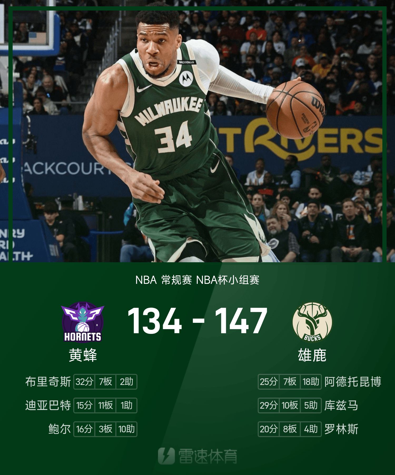 6686体育11月15日讯 25/26赛季NBA 常规赛 NBA杯分组赛,雄鹿对阵黄蜂。双方全场战罢,雄鹿147-134战胜黄蜂。库兹马得到29分10板5助率队取胜,布里奇斯空砍全场最高的32分7板2助。