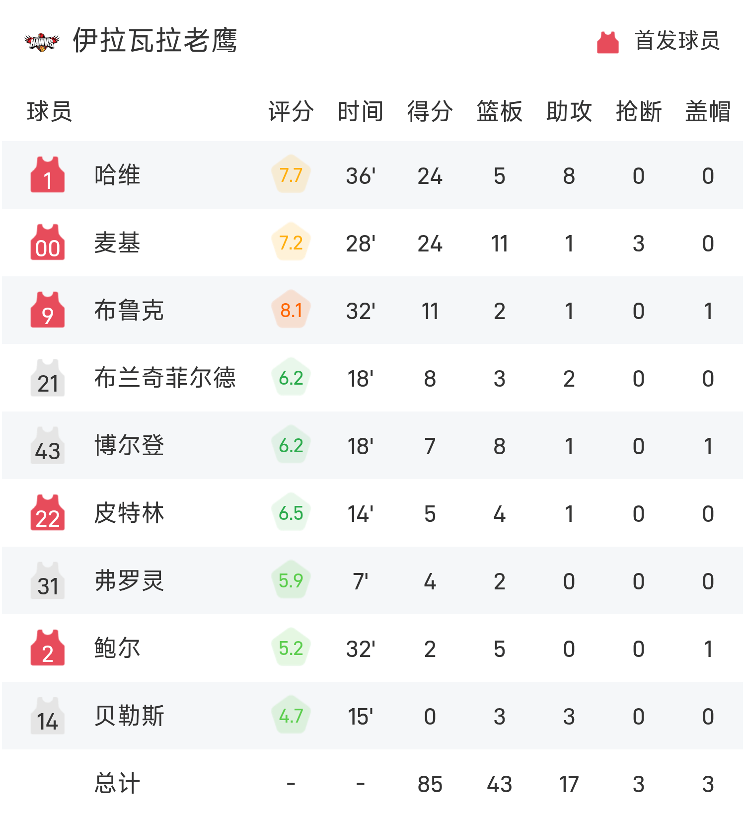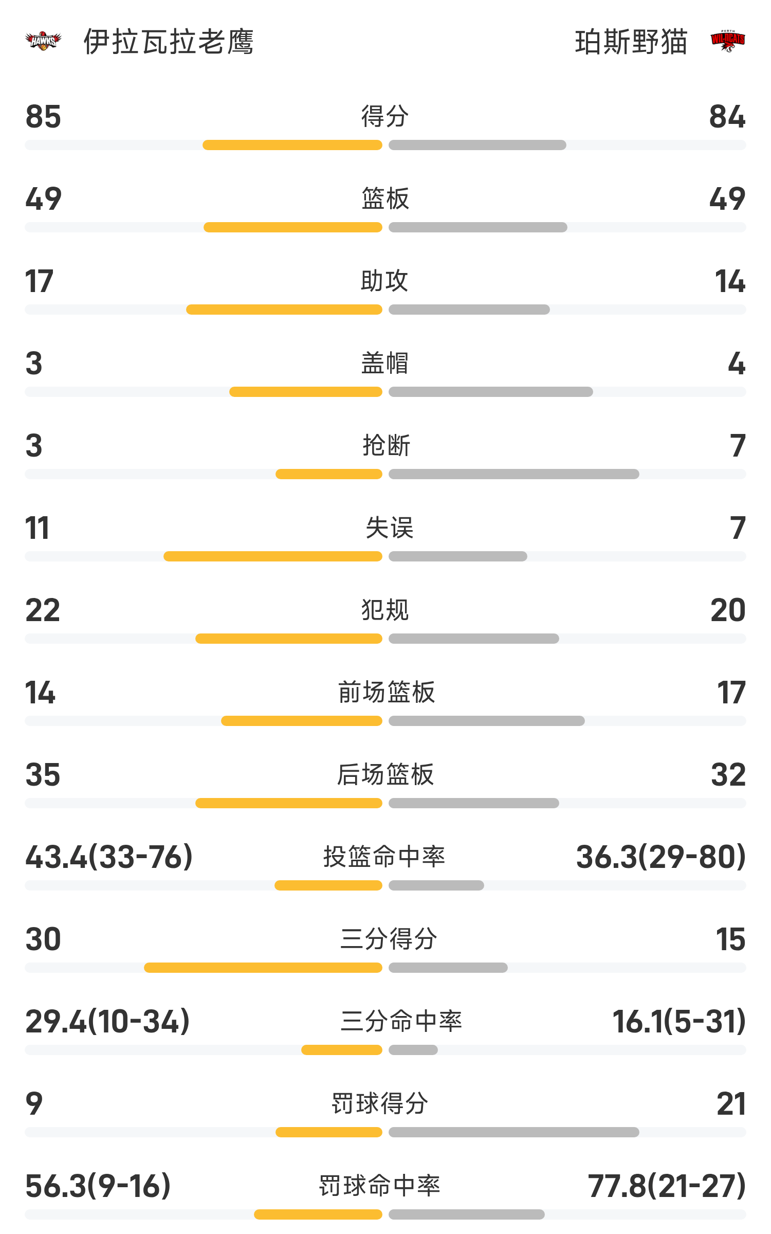 6686体育10月25日讯 25/26赛季NBL 常规赛,珀斯野猫对阵伊拉瓦拉老鹰。双方全场战罢,珀斯野猫84-85不敌伊拉瓦拉老鹰。哈维砍下全场最高的24分5板8助,率领伊拉瓦拉老鹰胜利取胜。