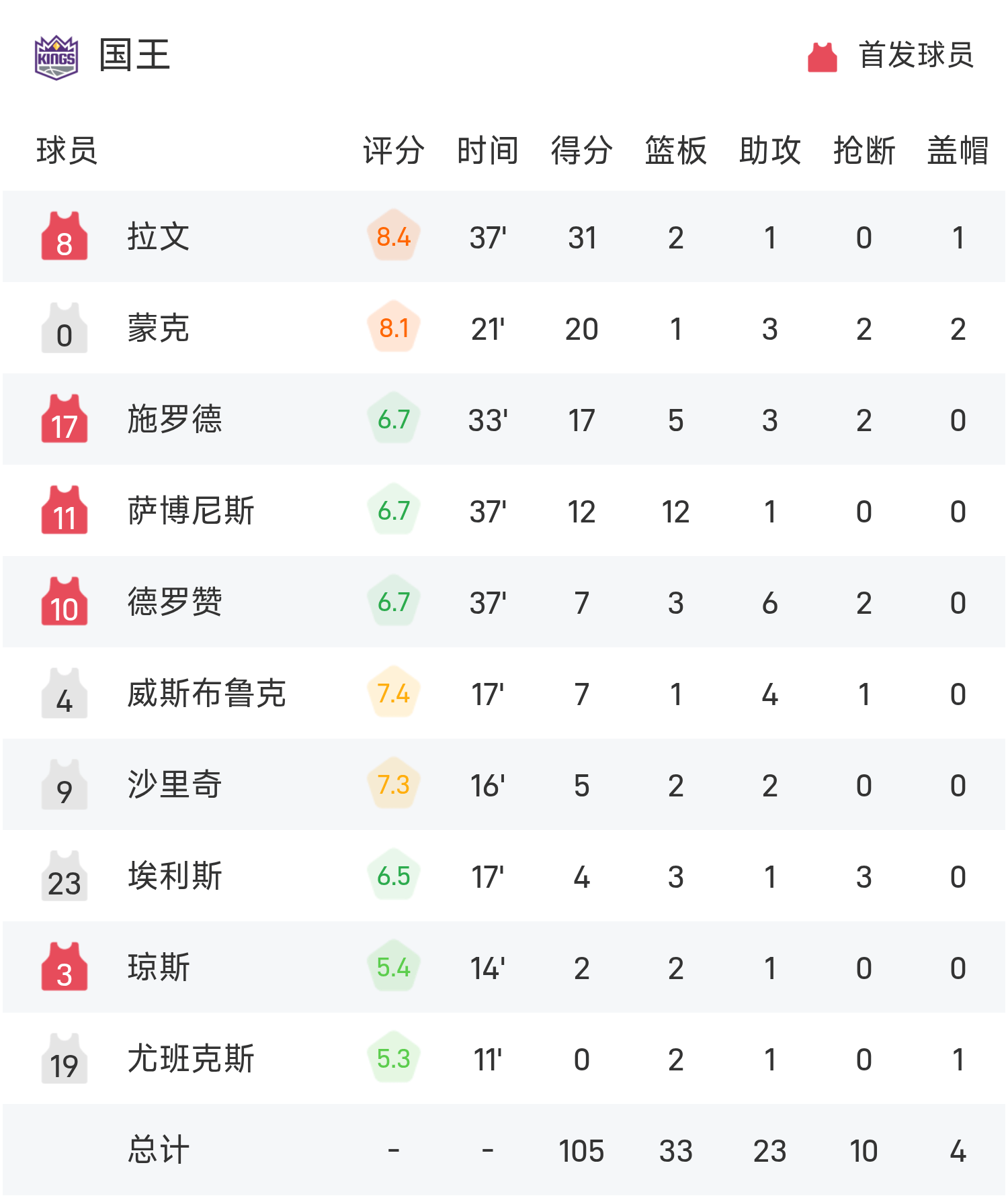 6686体育10月25日讯 25/26赛季NBA 常规赛,国王对阵爵士。双方全场战罢,国王105-104战胜爵士。拉文得到31分2板1助率队取胜,马尔卡宁空砍全场最高的33分4板1助。