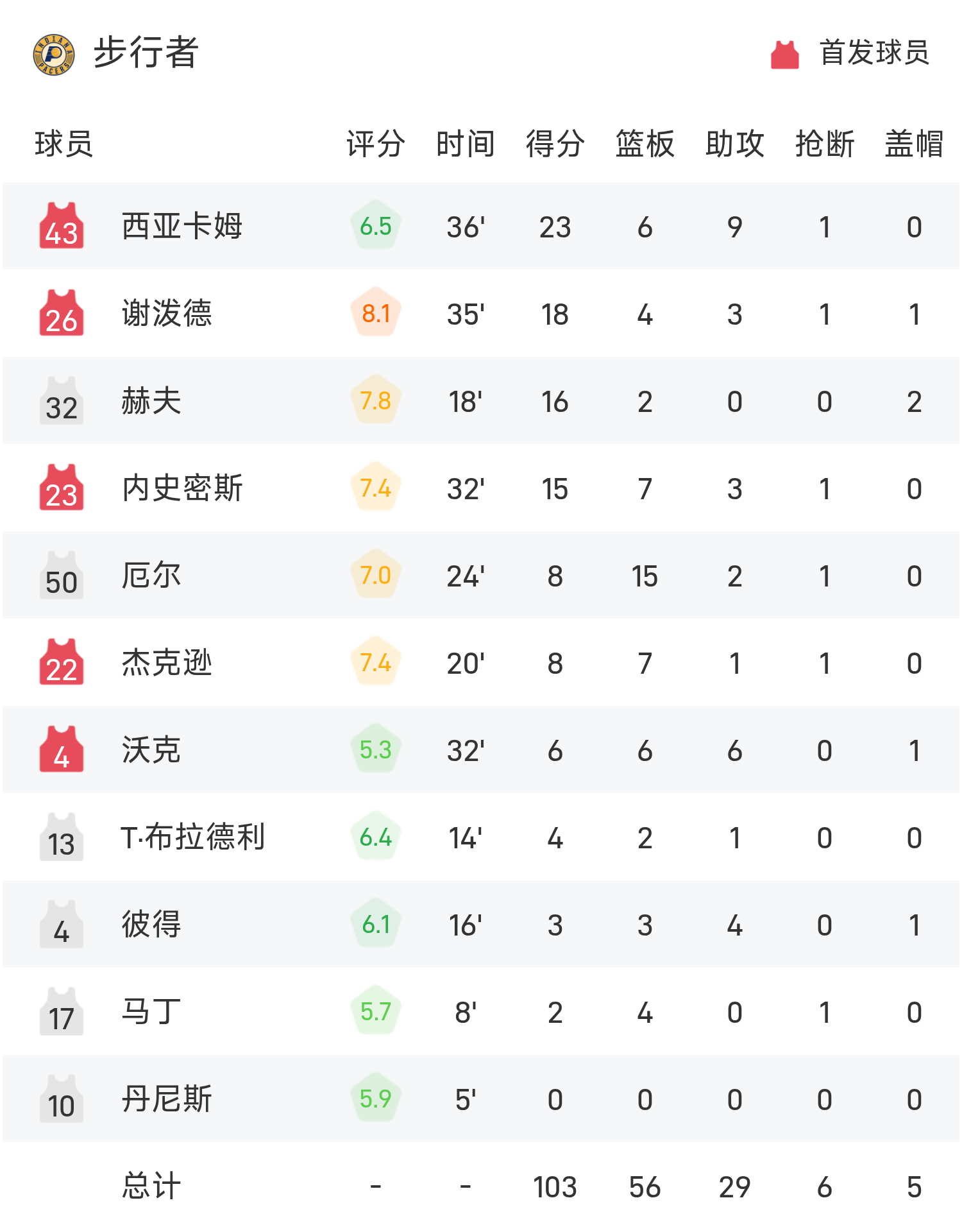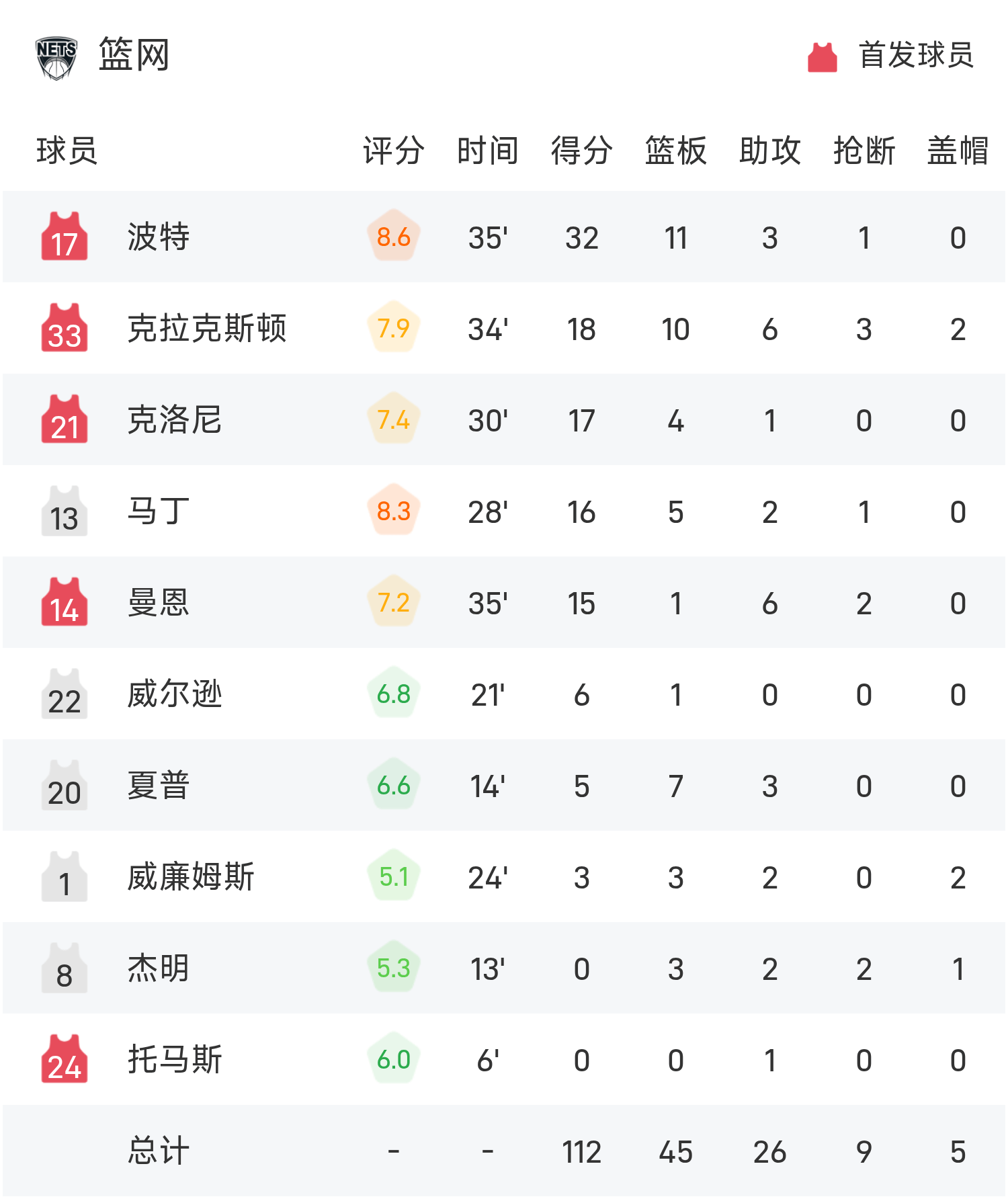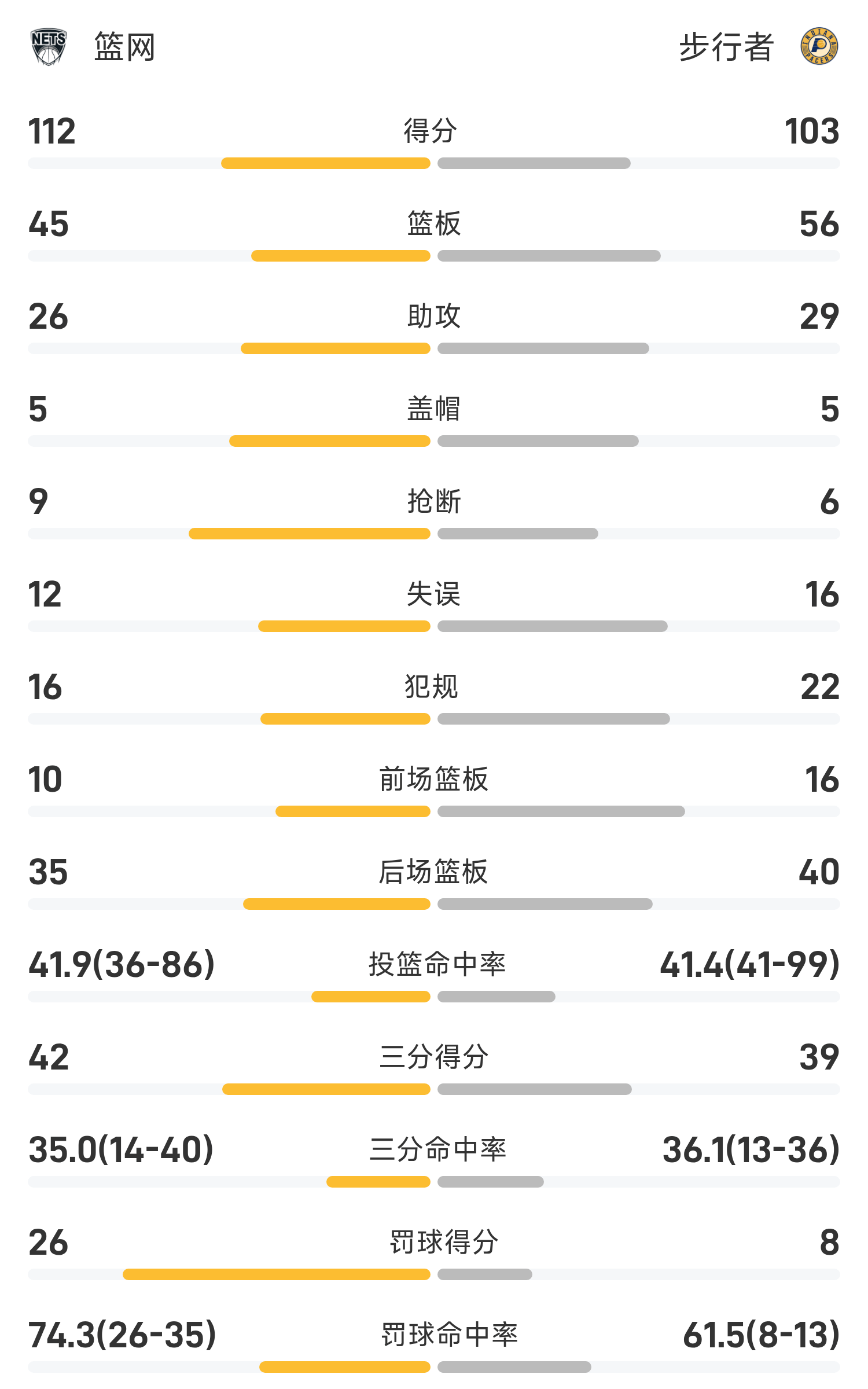 6686体育11月06日讯 25/26赛季NBA 常规赛,步行者对阵篮网。双方全场战罢,步行者103-112不敌篮网。波特砍下全场最高的32分10板2助,率领篮网胜利取胜。