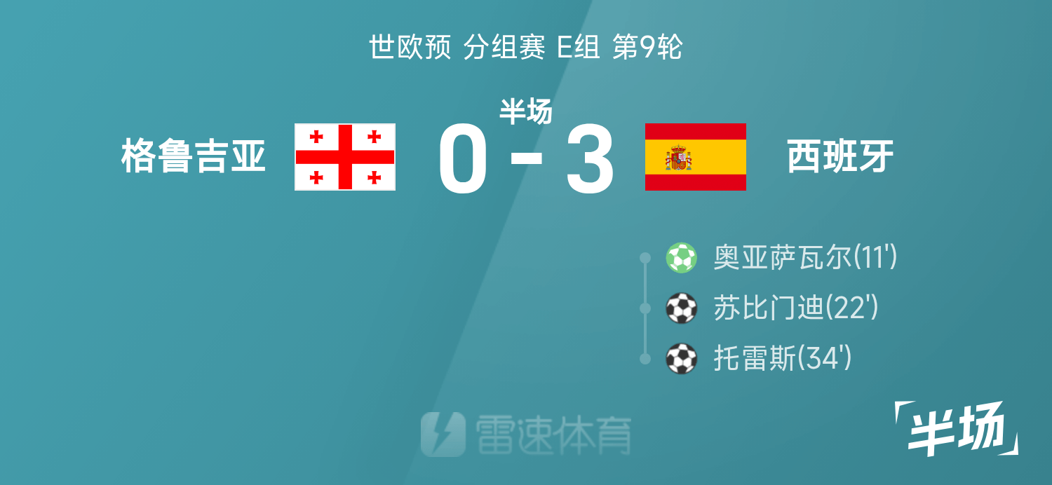 世欧预半场:奥亚萨瓦尔传射,西班牙3-0格鲁吉亚